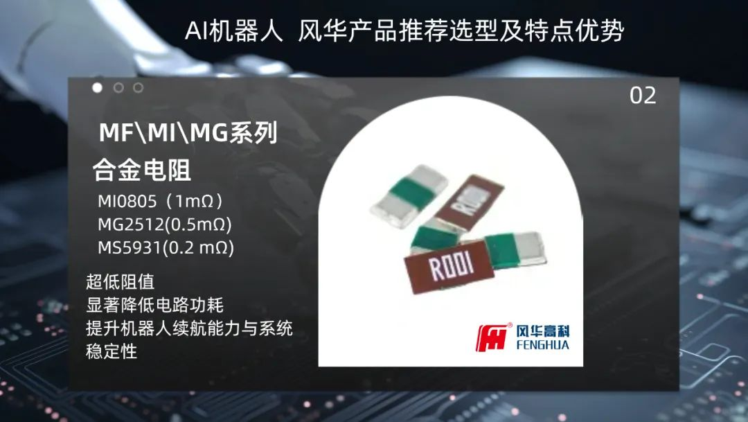在電流檢測方面,合金電阻MFMIMG系列,如MI0805(1mΩ)、MG2512(0.5mΩ)、MS5931(0.2 mΩ)等,憑借其超低的阻值,顯著降低了電路的功耗,優(yōu)化電源轉換效率,進一步提升機器人的續(xù)航能力與系統(tǒng)穩(wěn)定性。