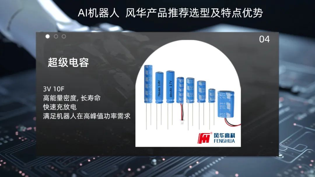 為了進一步提升AI機器人的電源性能,特別推薦具有高能量密度、快速充放電以及長壽命等優(yōu)點的超級電容器,能夠在短時間內(nèi)提供大量電能,滿足機器人在高峰值功率需求時的穩(wěn)定供電。結合上述高性能元器件,超級電容器將為AI機器人提供更加持久、穩(wěn)定的電源支持,助力其在復雜環(huán)境中高效運行。