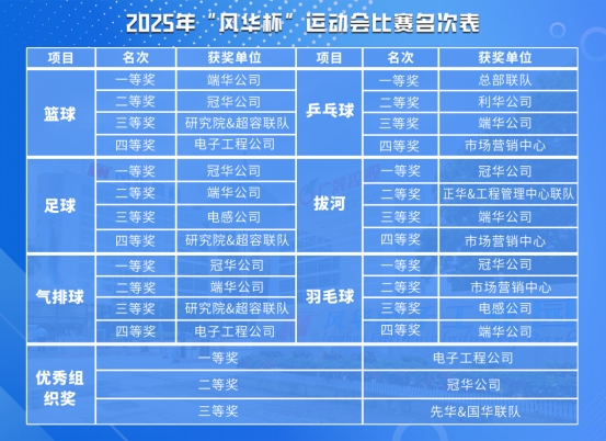 經(jīng)過(guò)多輪激烈角逐,各大獎(jiǎng)項(xiàng)塵埃落定。冠華公司憑借過(guò)硬的實(shí)力和頑強(qiáng)的拼搏精神,一舉斬獲足球、羽毛球、氣排球、拔河四項(xiàng)冠軍;總部聯(lián)隊(duì)則憑借默契的集體智慧和強(qiáng)勁的綜合實(shí)力,成功摘得乒乓球項(xiàng)目桂冠。此外,電子工程公司、冠華公司、先華與國(guó)華聯(lián)隊(duì)因賽事組織有序、參賽熱情高漲,榮獲優(yōu)秀組織獎(jiǎng)。